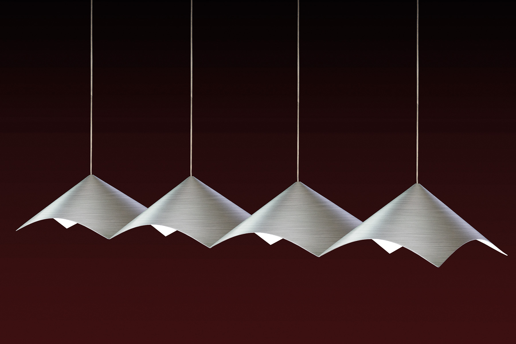 Jüngstes Ergebnis der einzigartigen Kreativpartnerschaft ist die minimalistische Pendeleuchte Iperbole. Ihr liegt ein ebenso simples wie raffiniertes Spiel mit elementaren Geometrien zugrunde. Ein Kegelprofil trifft hier auf einen quadratischen Grundriss: Jede Seite beschreibt eine Hyperbel und kreiert Bögen, die aus verschiedenen Blickwinkeln die hell erleuchtete Innenfläche sichtbar machen. Dabei schirmt die hyperbolische Form den direkten Blick auf die Linse ab. Bereits einzeln ein formvollendetes Stück Design, lässt sich die Leuchte auch zu verschiedensten offenen oder geschlossenen Formationen zusammenfügen. Der lediglich aus dünnem, nur 1,5 Millimeter starkem Aluminiumblech bestehende Korpus verleiht Iperbole zudem große Leichtigkeit: Fast schwebend wirkt sie und erinnert gerade als Arrangement aus mehreren Leuchten an einen Schwarm Vögel.