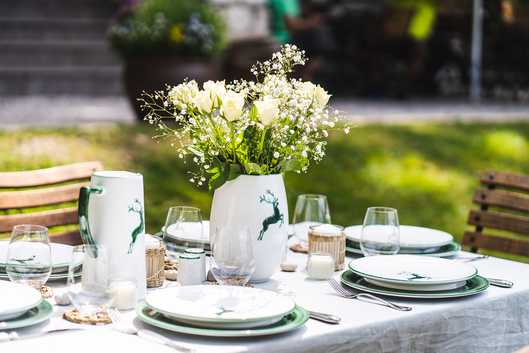 So wie die Keramik aus der österreichischen Manufaktur in Gmunden am Traunsee. Dort wird seit über fünf Jahrhunderten Geschirr von Hand gefertigt. Jedes Stück entsteht in vielen einzelnen Arbeitsschritten, vom Formen der Keramik bis zur Bemalung. Charakteristisch ist insbesondere die sogenannte Flammtechnik: Mit einem kleinen Malhorn tragen Keramikkünstler fließende Farblinien direkt auf die Glasur auf. Dadurch entstehen lebendige Muster, die nie exakt gleich aussehen. Viele der Dekore sind von der Natur inspiriert: etwa die feinen organischen Bänderungen des klassischen Grüngeflammten, das an Wiesen, Blätter und Sommerlandschaften erinnert. Andere Designs greifen Tiere und Blumen, grafische Elemente und traditionelle Motive auf. Gerade auf einer Sommertafel entfalten solche Muster ihre ganze Wirkung: Sie bringen Farbe, Leichtigkeit und eine gewisse Verspieltheit ins Arrangement.