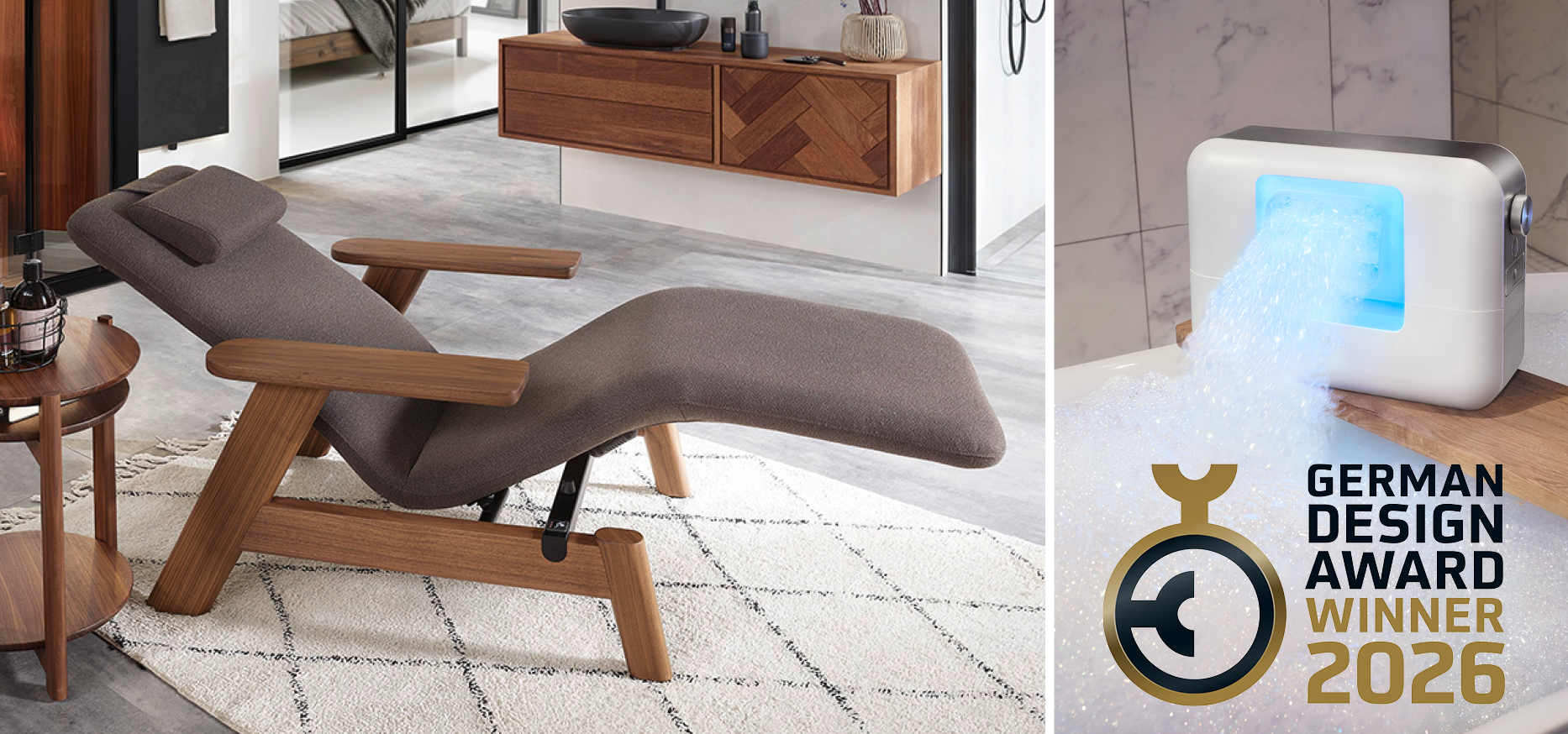 Wenn Leidenschaft, Handwerkskunst und Innovationskraft verschmelzen, entstehen Lösungen, die ein Stück Lebensqualität bedeuten und einen nachhaltigen Beitrag zur Gesundheitsvorsorge leisten. Genau für diesen Anspruch steht KLAFS – Weltmarktführer für Sauna, Wellness und Spa – und wird dafür in diesem Jahr gleich doppelt mit dem German Design Award ausgezeichnet. Die Wellnessliege SOMRA sowie das multisensorische Schaumerlebnis ESPURO® CloudSPA überzeugten die Jury mit ihrer außergewöhnlichen Verbindung aus Designqualität, technischer Finesse und emotionaler Tiefe.
