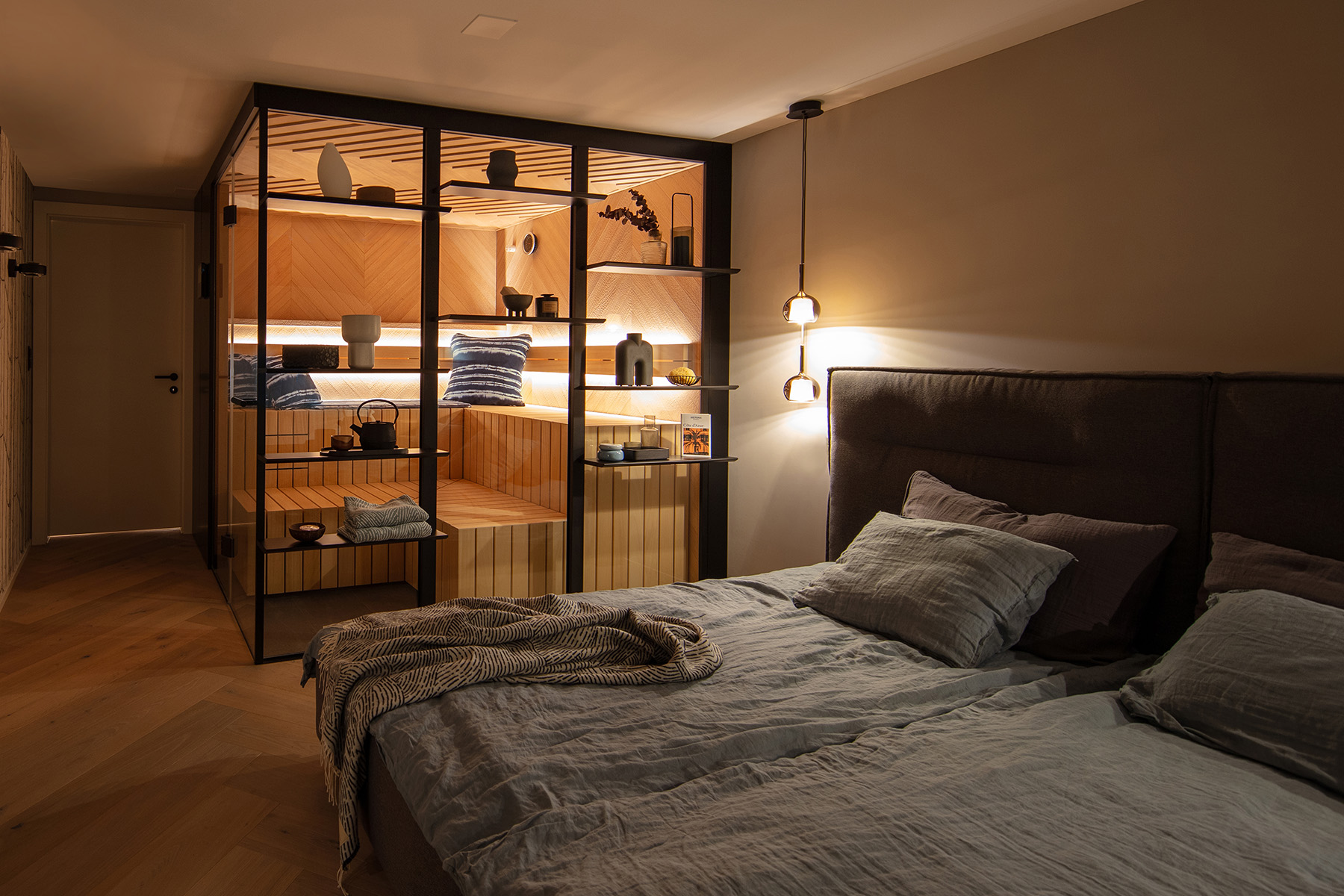 Mit ihrem eleganten Design, das skandinavischer Gemütlichkeit und japanischen Minimalismus vereint, passt die Sauna perfekt zum Wohnkonzept des Hauses. Dieses zeichnet sich durch einen nordischen Wohnstil mit Farbtönen wie Hellgrau, Blaugrau, Schwarz-Weiß und Holztönen aus.