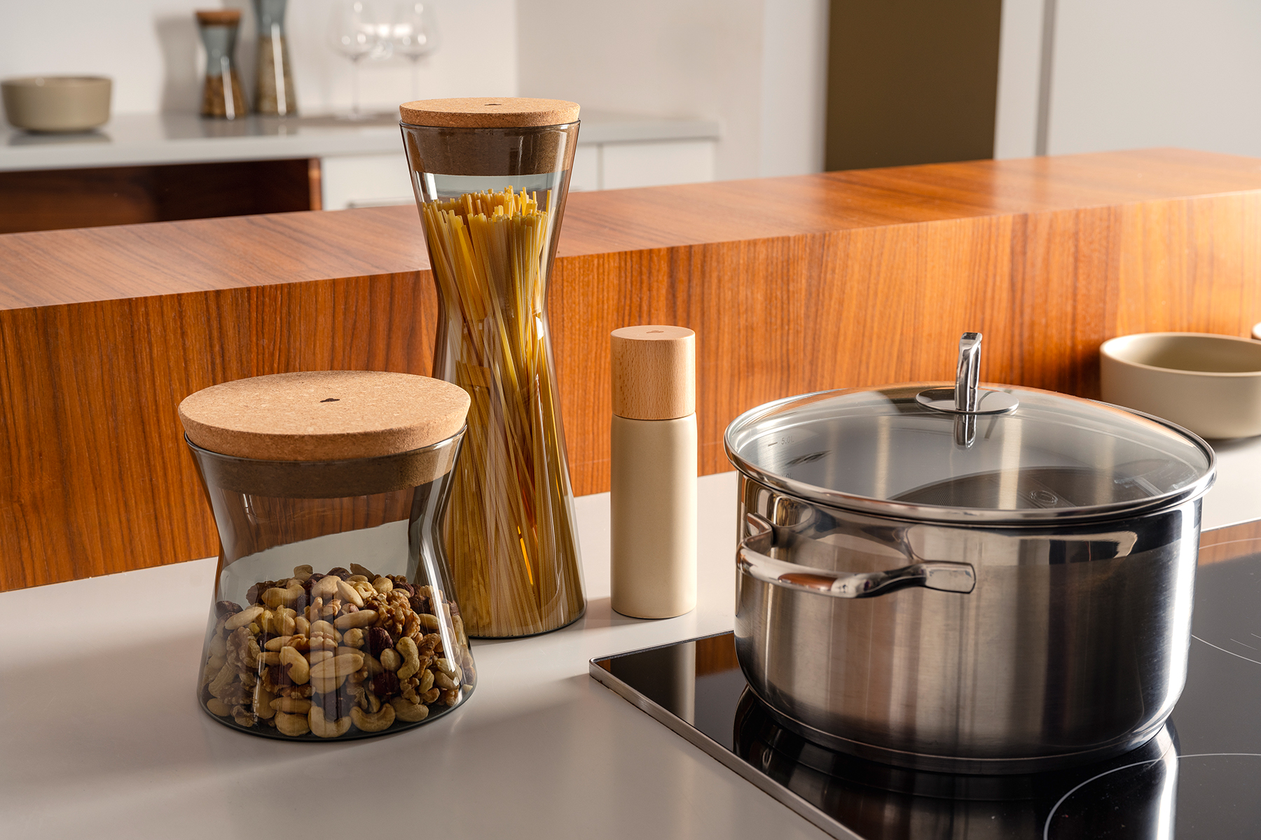 Für Liebhaber von offenen Raumkonzepten wird die Küche immer mehr zu einem integralen Bestandteil des Wohnraums. Die Kollektion FORMA X ist hierfür die ideale Ergänzung: elegante, rauchgraue Borosilikatglas-Dosen mit natürlichen Kork-Deckeln, die Ordnung, Stil und Funktionalität vereinen. Dank des Stickerbogens lassen sie sich individuell beschriften. FORMA X sind perfekte Küchenhelfer, da die Dosen durch ihre Hitzebeständigkeit auch für die direkte Zubereitung von Speisen wie Spaghetti oder leckere Tassenküchlein, geeignet sind.