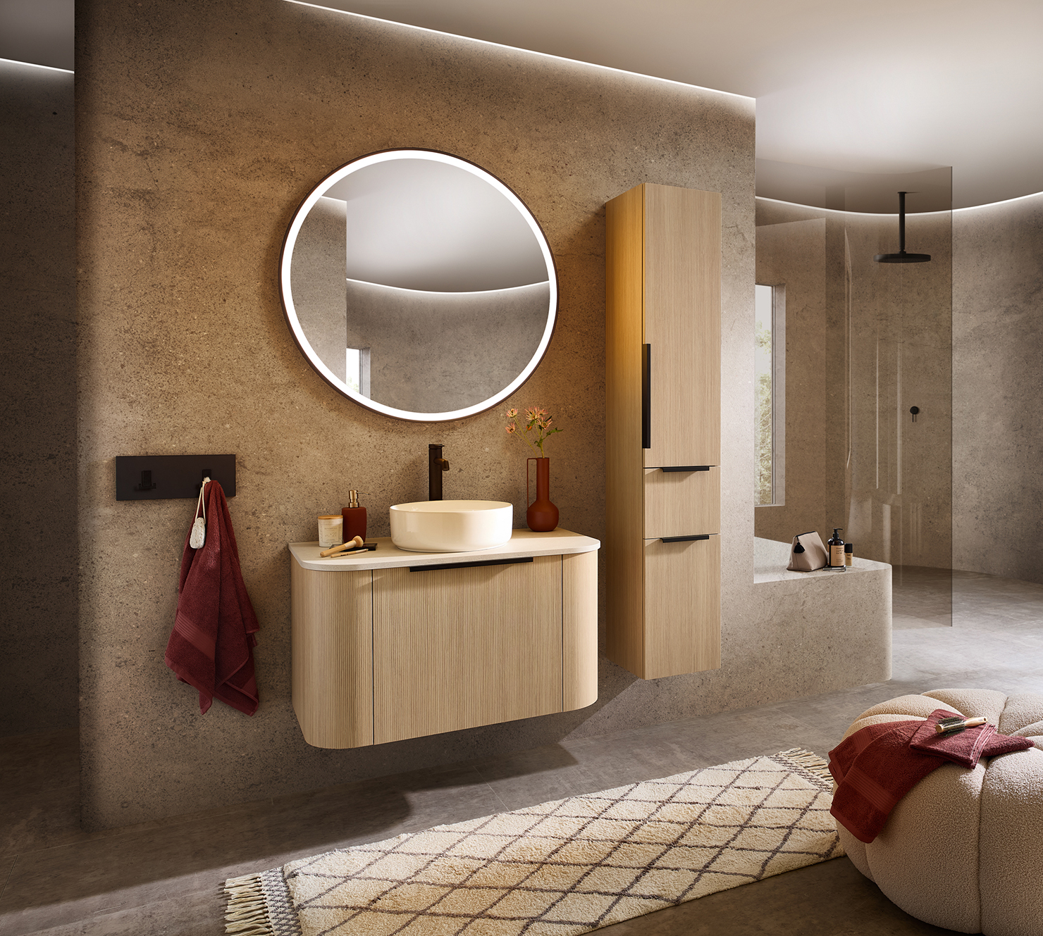 Sanft geschwungene Linien statt kantigem Kubismus: Die neue Serie 7200 setzt mit ihrem organisch-eleganten Design ein stilvolles Zeichen und der helle Dekorton „Linea Eiche Hell Aufrecht NB“ verleiht ihr natürliche Wärme und Frische. Weiche Rundungen umfließen die Möbelform, bilden einen harmonischen Rahmen und schaffen eine wohlige Ausstrahlung selbst in kompakten Raumgrößen. Weich abgerundete Fronten und Seiten heben sich wohltuend von klassischen, geradlinigen Baddesigns ab. Dieser authentische Look wirkt nachweislich einladend und beruhigend zugleich.