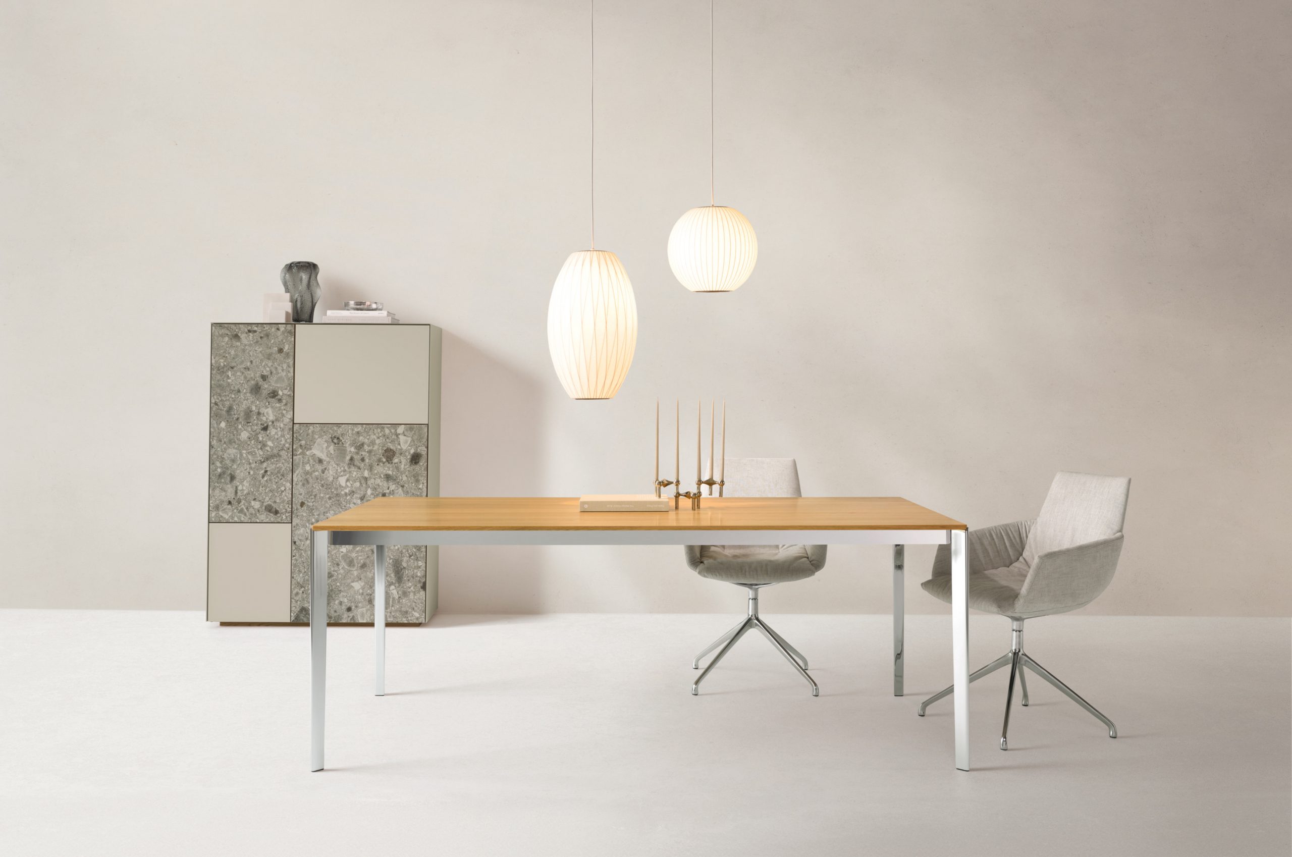 Gestaltungstipp: Neben der Stoffvariante ist das Olivgrün auch als neue Lederfarbe verfügbar. Fein aufeinander abgestimmt ergeben sich daraus harmonische Kombinationen, z. B. für den lui Stuhl im Materialmix.