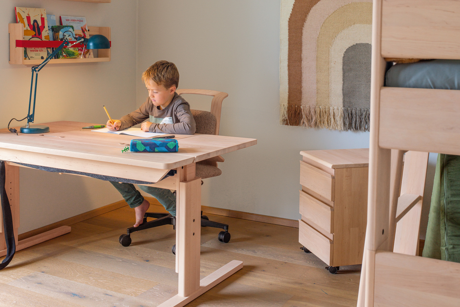 Spätestens mit dem Schuleintritt rückt die Arbeitsecke in den Mittelpunkt des Kinderzimmers. Der höhenverstellbare kids Schreibtisch wächst über viele Jahre mit und lässt sich an die jeweilige Körpergröße anpassen. Ergänzt wird er durch einen ergonomischen Drehstuhl, bei dem Sitzhöhe, Sitztiefe und Rückenlehne individuell eingestellt werden können. Eine neigbare Tischplatte, integriertes Kabelmanagement und praktische Schubladen sorgen dafür, dass der Arbeitsplatz langfristig funktional bleibt.