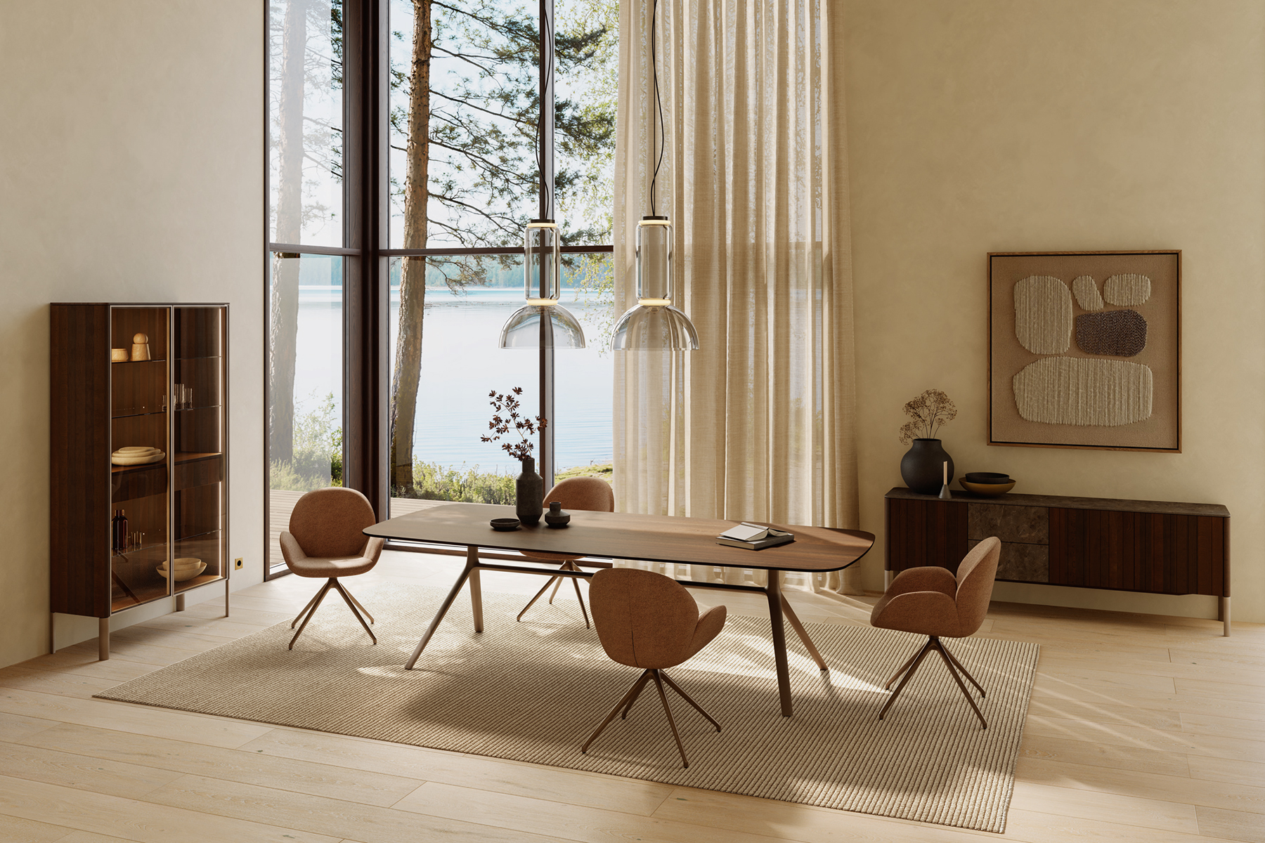 Die nya Familie zeichnet sich zudem durch ihre visuelle Leichtigkeit aus. Schlanke Silhouetten, erhöhte Korpusse und fein geformte Gestelle verleihen den Möbeln eine Anmutung von Schwerelosigkeit. Naturholz und Metall treten in einen Dialog, der Wärme und Präzision verbindet. Diese charakteristischen Gestaltungsprinzipien setzen sich in allen Entwürfen der Kollektion fort. Und diese Kontinuität ist es, die nya so besonders macht: Die Formensprache endet nicht beim einzelnen Möbelstück, sondern erstreckt sich vom Essplatz in den Wohnbereich und in die Küche.